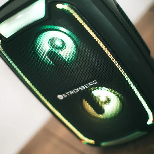 Stromberg Duncan. Compacto y fácil de transportar, una mezcla de potencia y diseño. Cuenta con un marco de luces audiorítmicas alrededor de los woofers principales y dos luces tipo flash en la parte superior e inferior. El Duncan es todo lo que está bien.